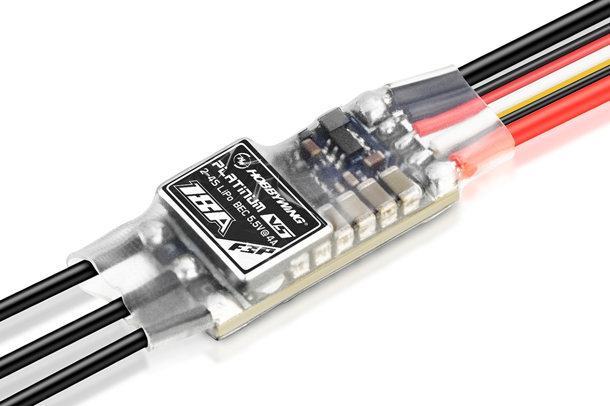 A top-of-the-line Hobbywing electronic speed controller, specially designed for 3D and 4D indoor aerobatic model aircraft. Features a bidirectional mode for 4D flying, with brake and motor reverse function. Switch-mode BEC provides 5.5 V at 4/6 A. Continuous current rating of 18 A, peak current up to 30 A. Supports 2–4S LiPo batteries. Weight: 11.9 g. Dimensions: 24.6 × 12.8 × 7.5 mm.